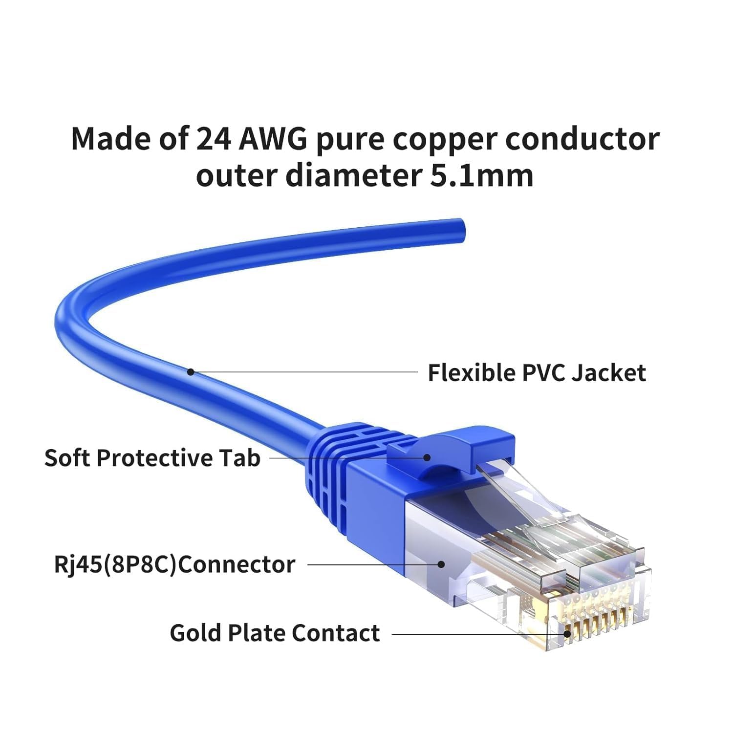 • Durable Blue PVC Jacket & Gold-Plated RJ45 Connectors: Built with high-quality PVC jacket and 50-micron gold-plated RJ45 connectors for corrosion resistance and long-lasting connectivity. This blue cat6 cable withstands bends, pulls, and daily wear – perfect as durable ethernet cable, long ethernet cable near me, or 50m cat6 setups (cut to 3m precision).